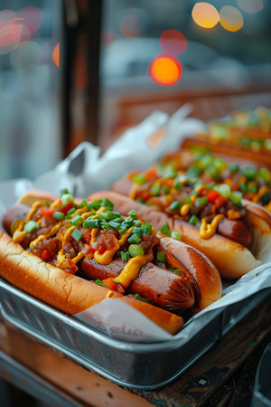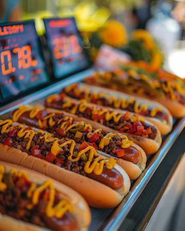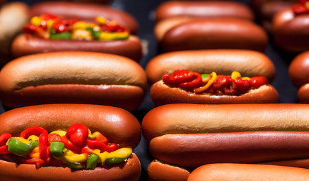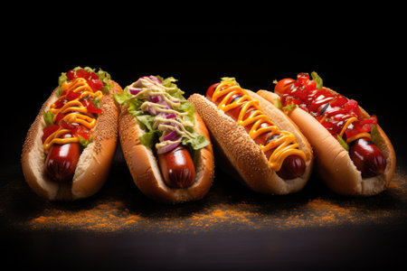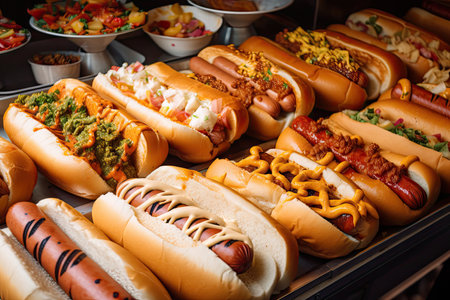 display of hot dogs and sausages with different flavors and toppings, created with generative ai