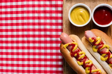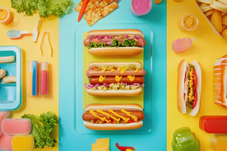 Enjoy a vibrant image of two tasty hot dogs topped with mustard, ketchup, and relish. Perfect for summer gatherings and food promotions.