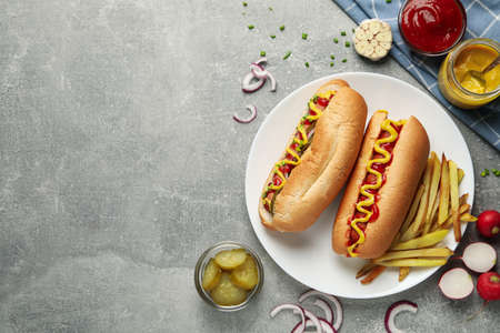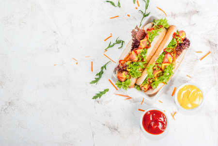 Homemade hot dogs with sausages, fresh lettuce, cucumbers, herbs, mustard and ketchup. On the white stone concrete table top view, copy space