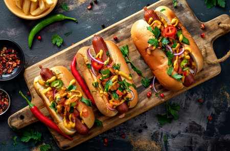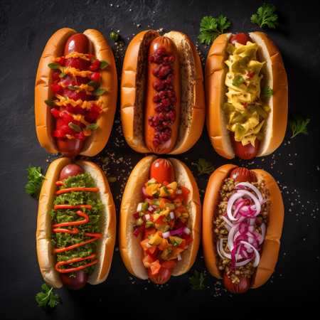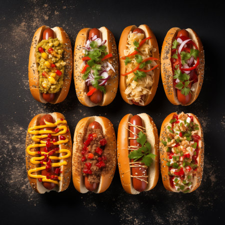 An array of gourmet festival hot dogs with unique toppings, top view, copy space, no people
