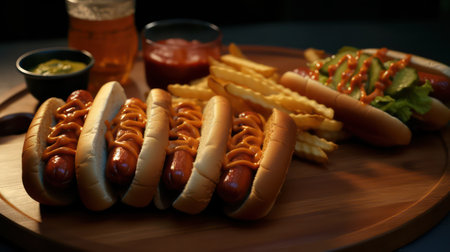 Set of hot dogs with sauces on wooden tray. Delicious yummy street food. Generative AI