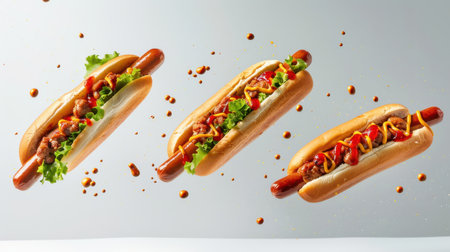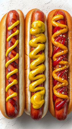 Three hot dogs sit in buns, each topped with yellow mustard and red ketchup. The arrangement showcases vibrant colors and perfect condiments for a tasty outdoor meal.