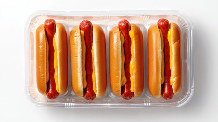Top view of raw hot dogs in packaging, isolated on a plain white background with clipping path for food advertisements