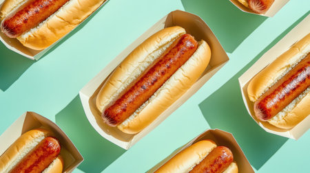 Classic Retro Hotdog With Grilled Sausage Seamless Background, Creative Pattern, Geometrical Design, Top View