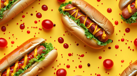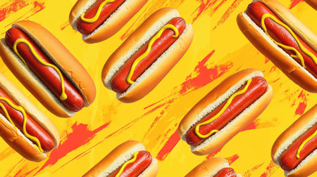 Repeated pattern of hot dogs with mustard on a lively background, ideal for illustrating classic American fast food.