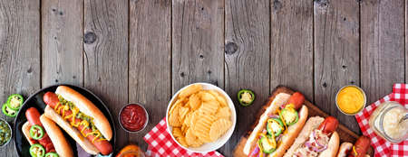BBQ hot dog bottom border. Overhead view table scene with a dark wood banner background
