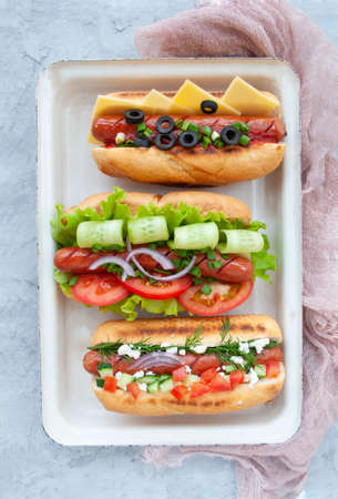 Flat lay of delicious hot dogs with vegetables and sausages.