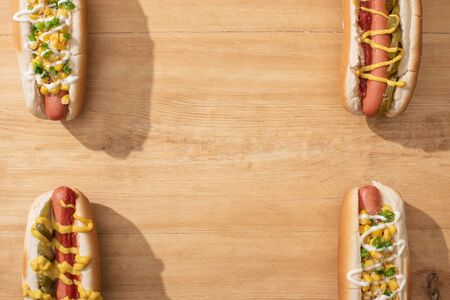 top view of delicious hot dogs with corn, green onion and pickles on wooden table