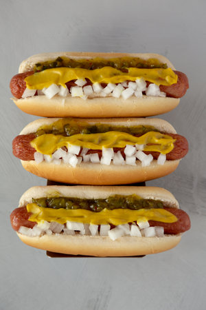Homemade Deep Fried Hot Dogs with Mustard, Onion and Pickle Relish on a wooden board, top view.
