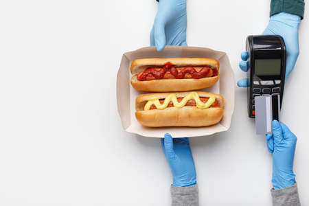 Courier in rubber gloves gives customer cardboard box with hot dogs with grilled sausages, with ketchup and mustard. Customer pays bill with credit card and contactless terminal, isolated on white background
