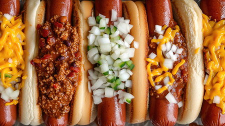 A variety of festival hot dogs with chili, cheese, and onion toppings, top view, copy space, no people