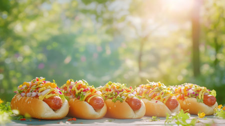 Five gourmet hot dogs topped with vibrant and fresh ingredients are displayed in a sunny garden, perfect for a summer picnic or outdoor celebration.