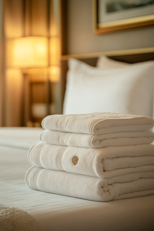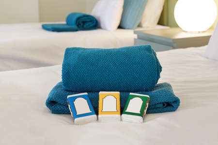 Close up of bath towels on the bed in the hotel room with copy space