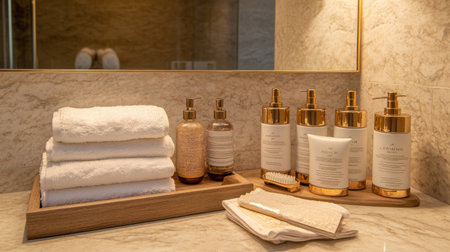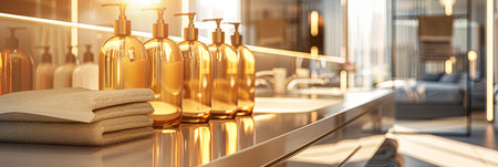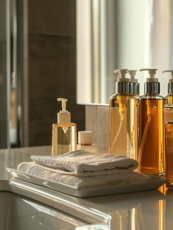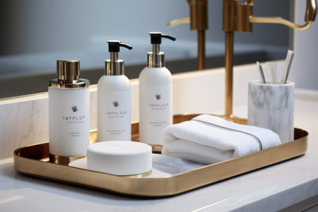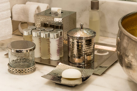 Bath set : shampoo, conditioner, lotion in a luxury hotel suite bathroom
