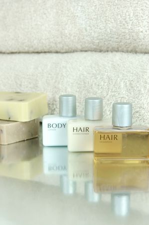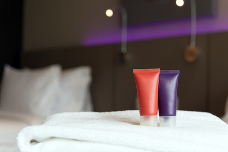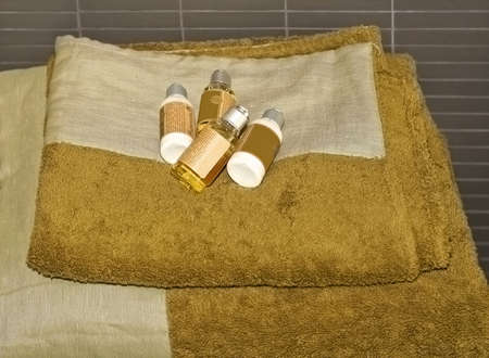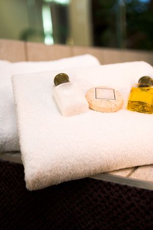Mini bottles of cosmetics and towels on the table in the hotel room