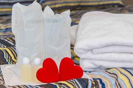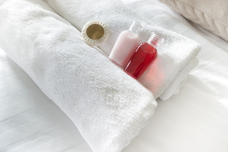 Group set of free hotel amenities (such as towels, shampoo, soap, gel etc) on the bed. Hotel amenities is something of a premium nature provided in addition to the room when renting a room.
