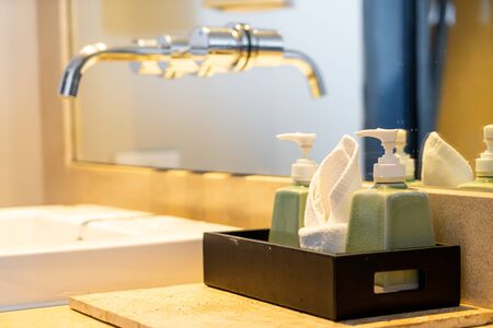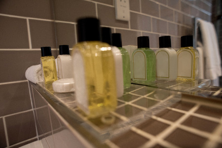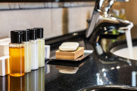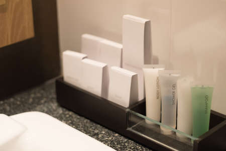 Hotel bathroom, complimentary toiletries, Shampoo and shower gel, Set of toiletries placed at sink in the bathroom