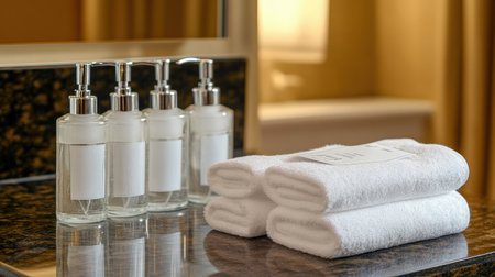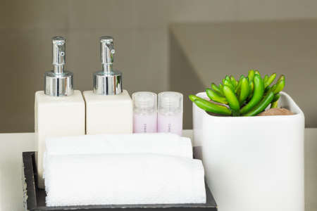 Close up view on the bottles with shampoo, shower gel and towels in the hotel bathroom