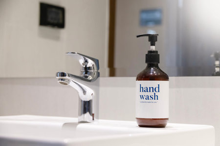 Bathroom hygiene routine modern hand wash bottle dispenser cleanliness freshness scent skincare sanitization clean soap faucet essential product care aroma scent surface