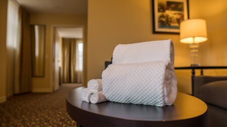 White towel in bedroom, Stack of plush hotel towels