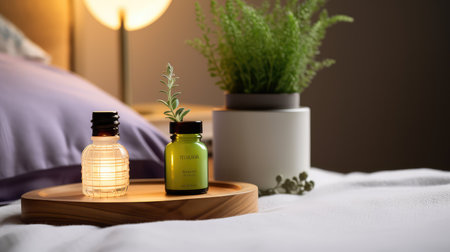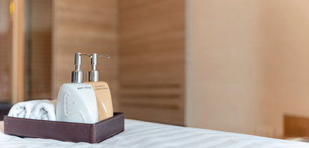 Luxury and hygiene concept, rolled bath towels at hotel spa. New towels, shampoo, and shower cream were placed on a wooden tray on the bed in the bedroom. Panorama for inserting advertising messages