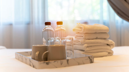 Hotel room interior. Hotel room with modern interior, two towels on the bed in the hotel room and pure drinking water for tourists. Free space for advertising materials