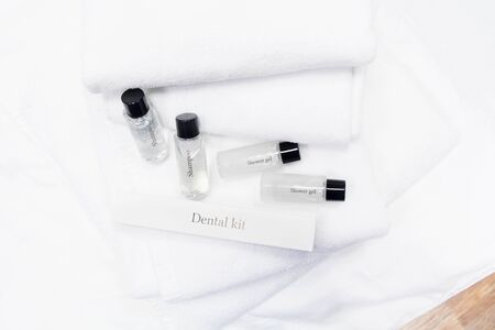 Hotel shower set with white towels, dental kit, shampoo and shower gel. Selective focus