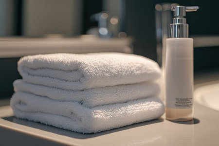 Neatly stacked towels with a bottle of facial toner beside them