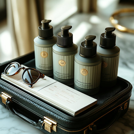 small cleaning bottles in hotel bathroom
