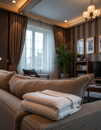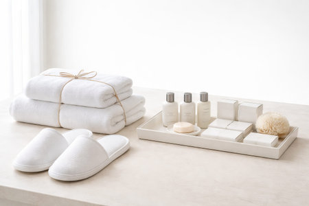 Luxurious white spa set with towels and slippers on minimalist background for relaxation. concept of self-care, relaxing spa day, elegant comfort.
