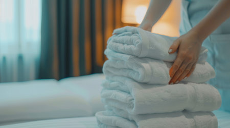 Professional housekeeper setting fresh towels in hotel room close up shot of maid's hand