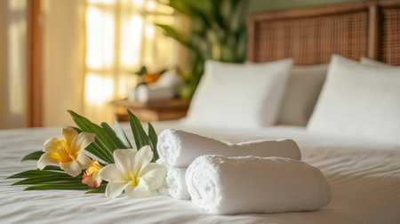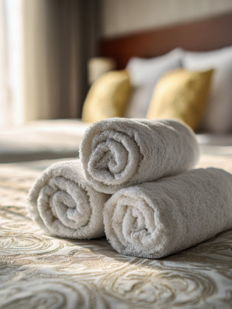 A tranquil bedroom scene with pristine rolled towels resting on an intricate bedspread, illuminated by gentle sunlight filtering through a welcoming window.
