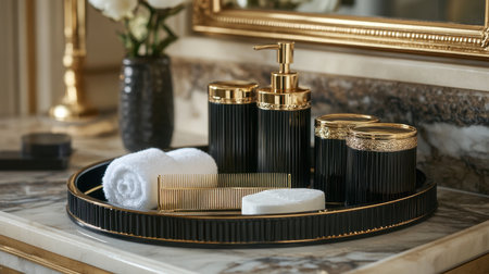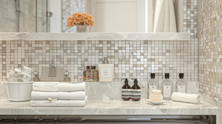 Modern Bathroom Countertop with Toiletry Bottles and Geometric Tiles