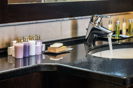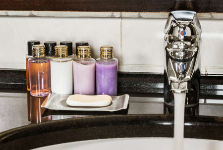 Water flows from the tap in the bathroom. Mini bottles of cosmetics on the table in the hotel room