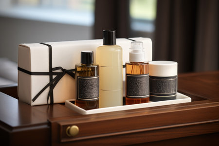 Mini bottles of cosmetics on the table in the hotel