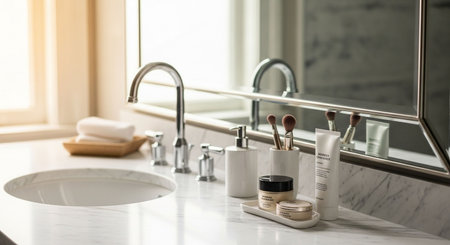 Close up of cosmetic products on countertop in bathroom interior.