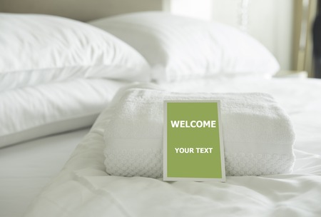 White towel on bed decoration in hotel bedroom interior - Vintage Light Filter