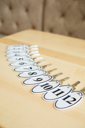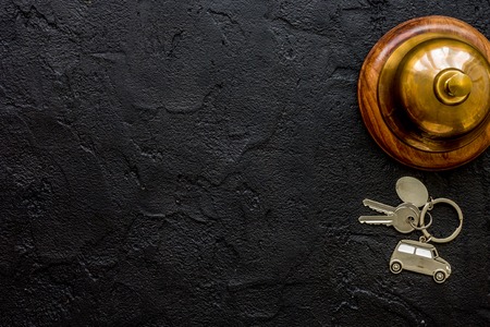 hotel reception desk with ring and keys dark table background to