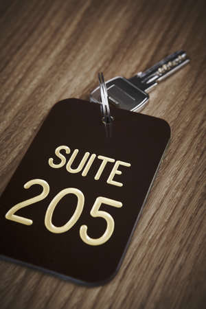 Hotel suite key with room number 205 on wood table vertical