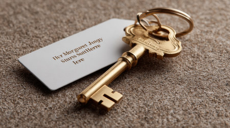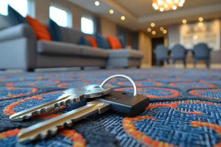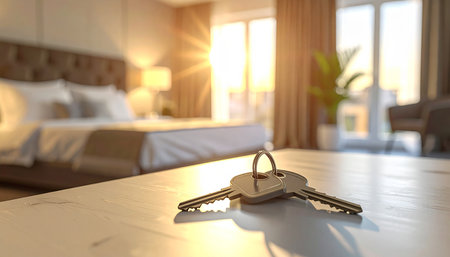 Real estate investment symbolized by keys on a table in a modern hotel room, emphasizing rental opportunities. Focus on contemporary decor and hospitality