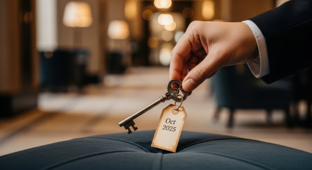 A hand in a suit holds an ornate vintage key with a tag showing Oct 2025, symbolizing future access or property in a luxury hotel environment.