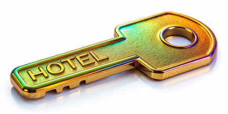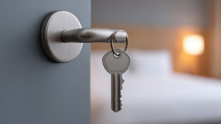 A close-up of a silver key hanging from a door knob, set against a softly lit hotel bedroom backdrop, evokes feelings of comfort and inviting hospitality.