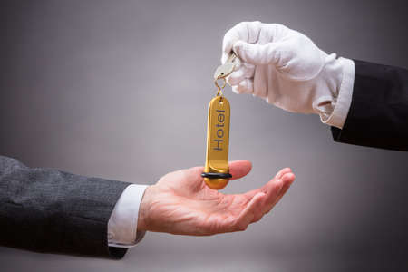 Close-up Of Receptionist Giving Hotel Key To Customer On Grey Background