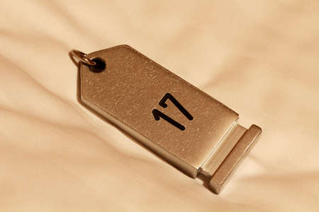 room key as typical in hotels or motels, laying on a fresh linen