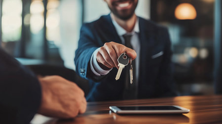 A smiling professional hands over keys during a business transaction in a modern office setting