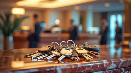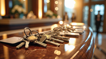 Keys arranged on a polished hotel reception counter during the evening with soft lighting creating a warm atmosphere