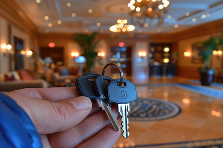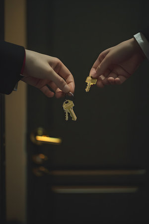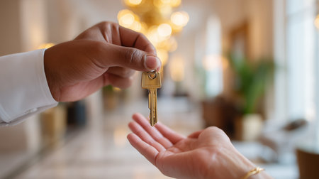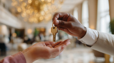 Beautiful golden key transfer in a bright hotel lobby