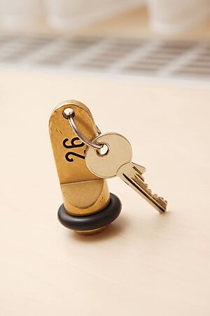 Close up shot of old hotel room key shot on wood front desk