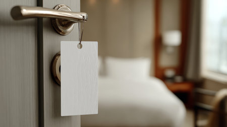 Close-up shot of white blank door hanger hanging on elegant handle, background hotel room softly blurred, ideal for marketing mockups