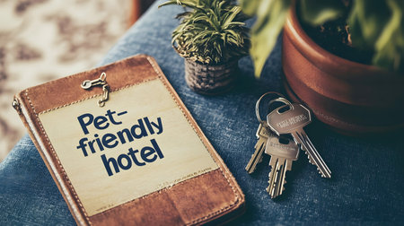 Pet-friendly hotel concept with vintage room keys on table near potted plants.